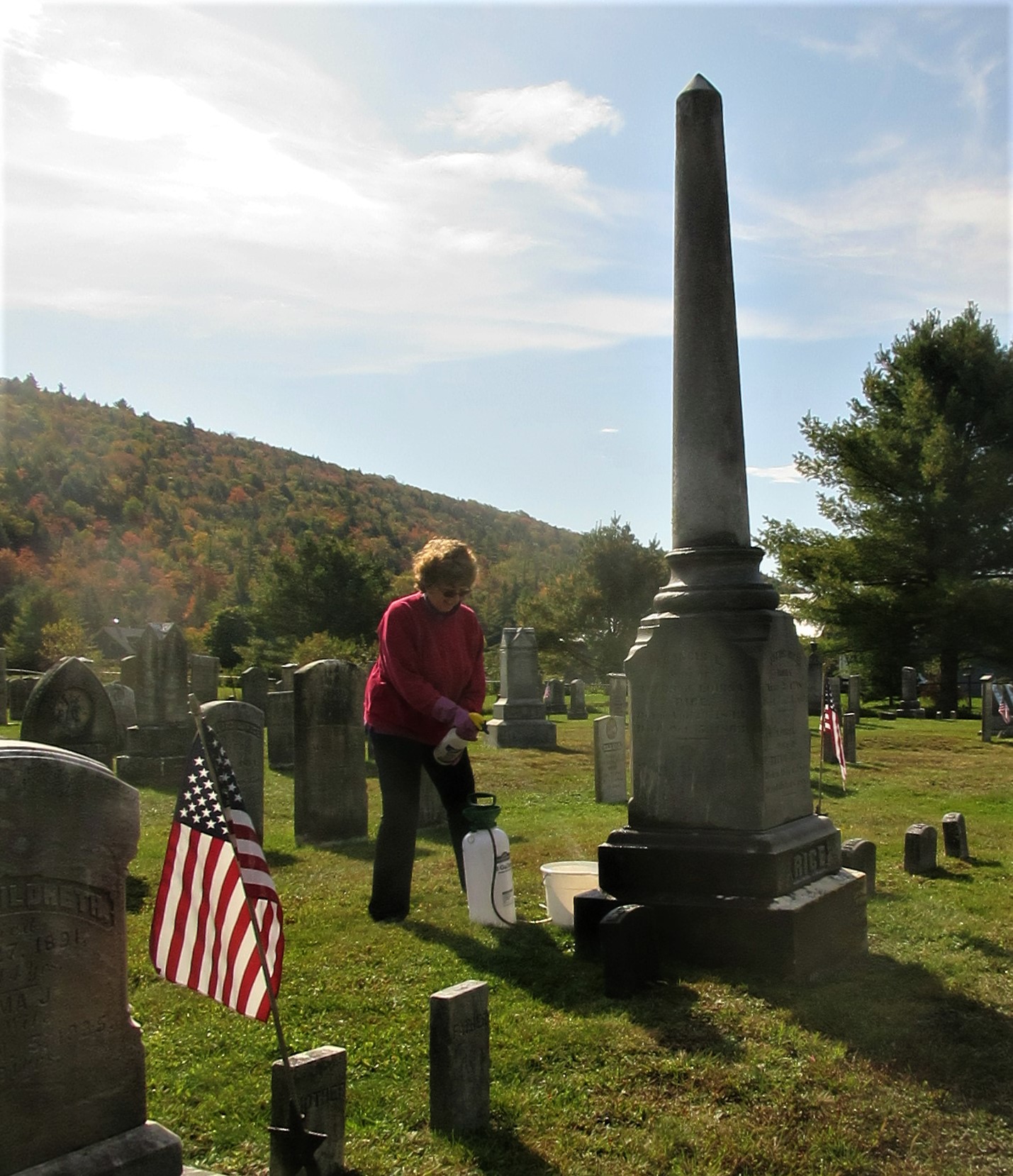 On September 28th, 2019, Wendy and Jack Cashman were joined by a crew of volunteers, who began cleaning headstones in the early portion of the Roxbury Cemetery. The weather held out, and a number of headstones were cleaned.